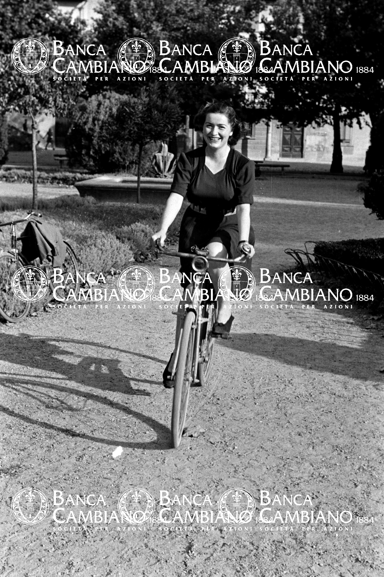 - ritratto di donna in bicicletta ai giardini pubblici in piazza Gramsci giĆ piazza marconi