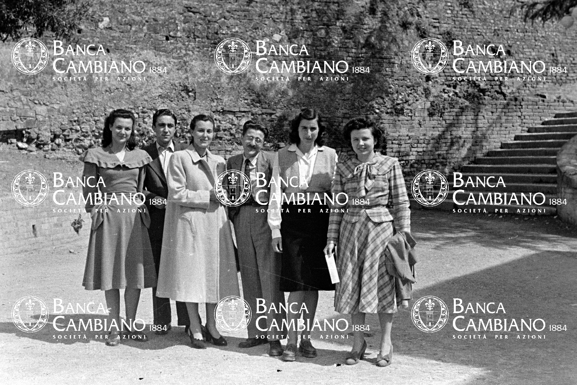 - Ritratto di gruppo in piazza Gramsci (da sinistra Eda Bagnoli, Marcello Isolani, Eda Righi, Francesco Parlavecchia, non individuata, Lina Maggiorelli)