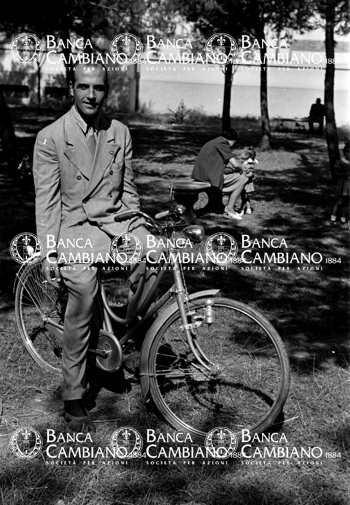- ritratto di uomo con bicicletta ai giardini pubblici vicino alla scuola elementare M. Tilli