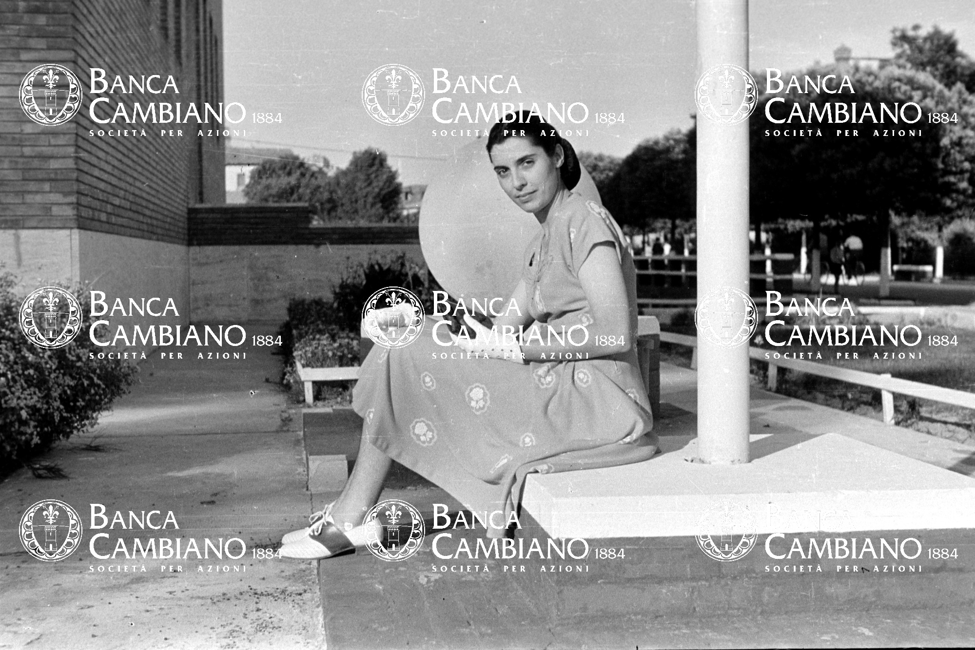 Ritratto di donna vicino all'edificio del cimitero americano
