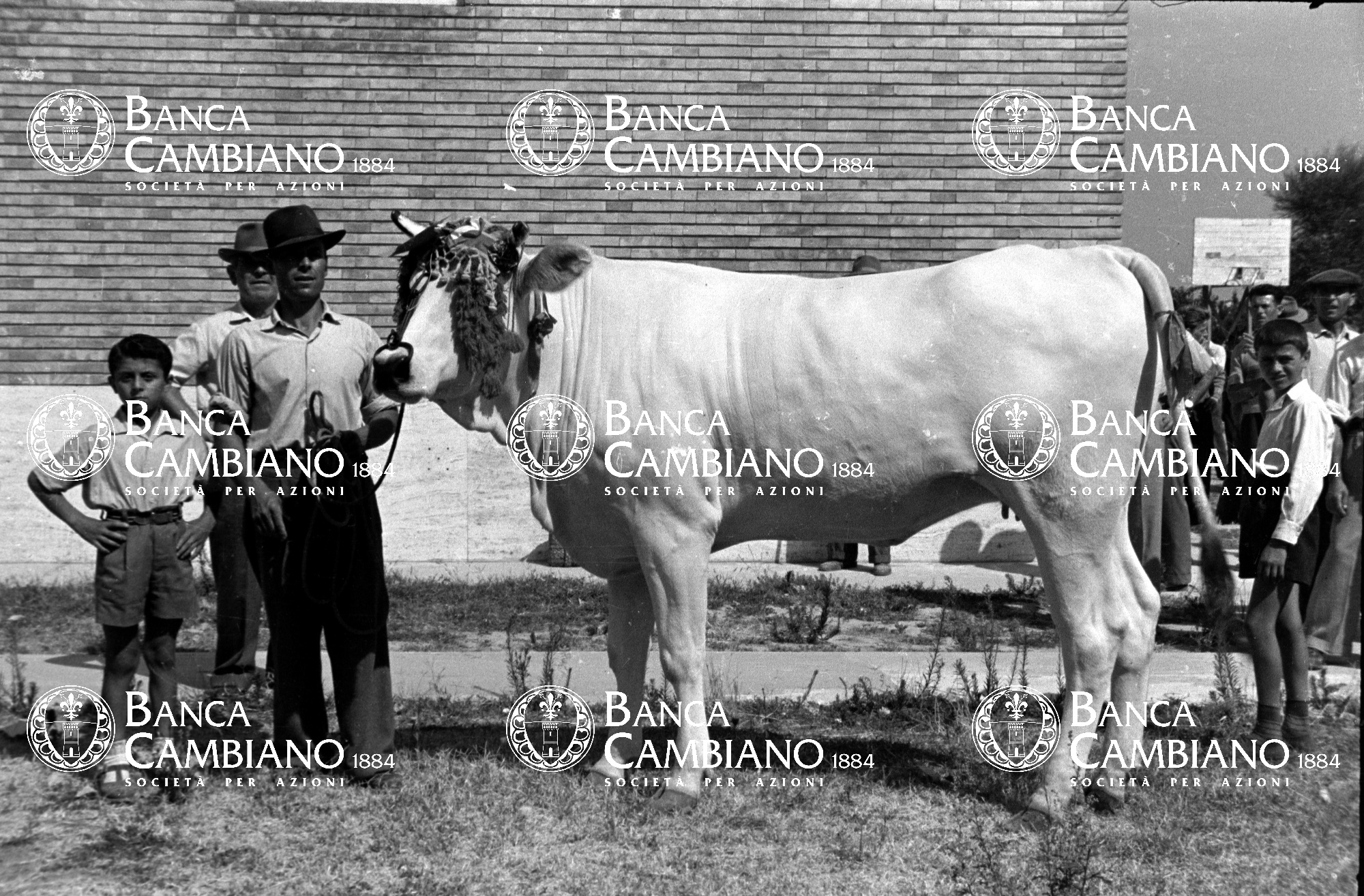 - Concorso zootecnico: ritratto di uomini con bove vicino all'edificio del cimitero americano