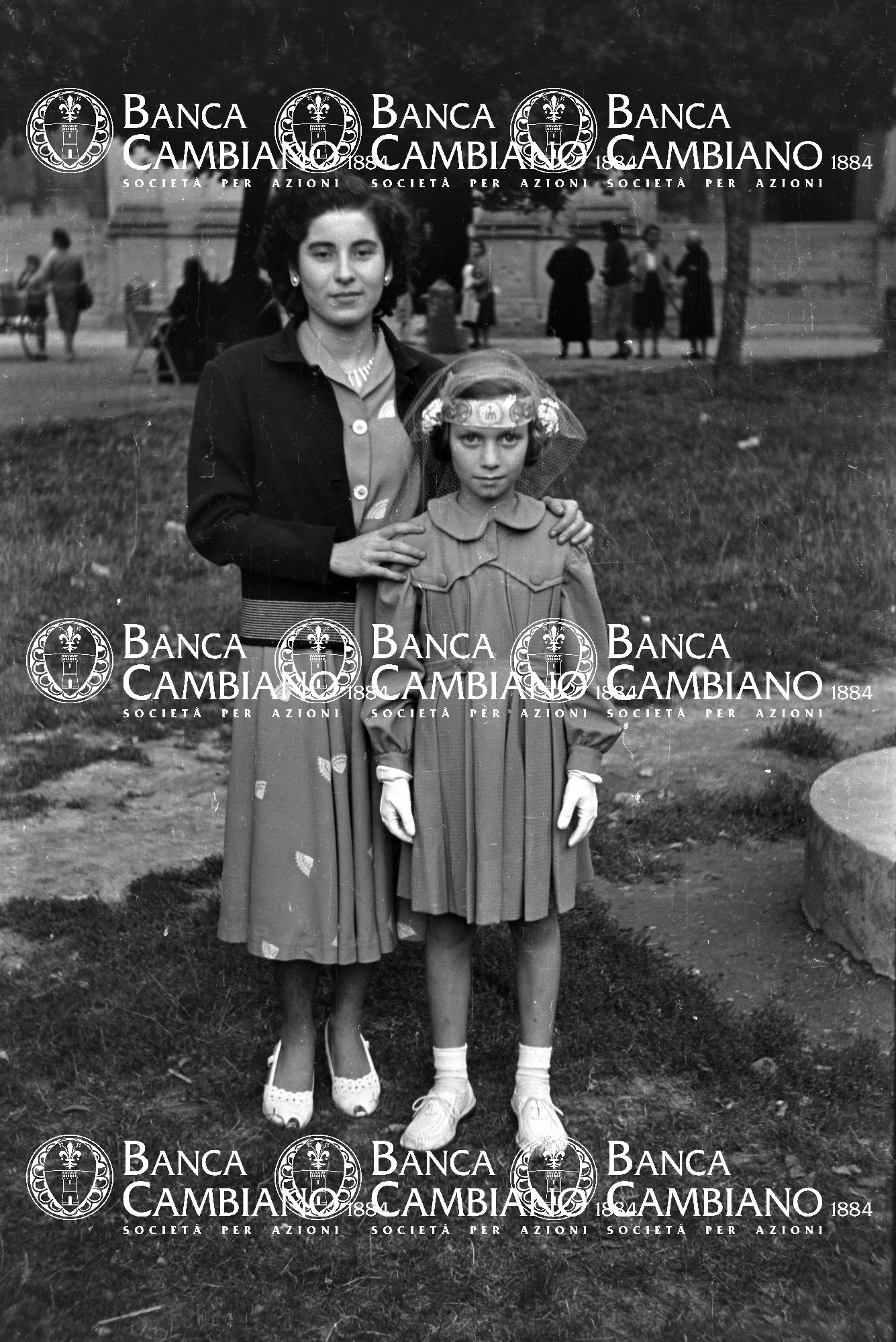 cresime: ritratto di donna con bambina nei giardini pubblici vicino alla chiesa di S.Verdiana
