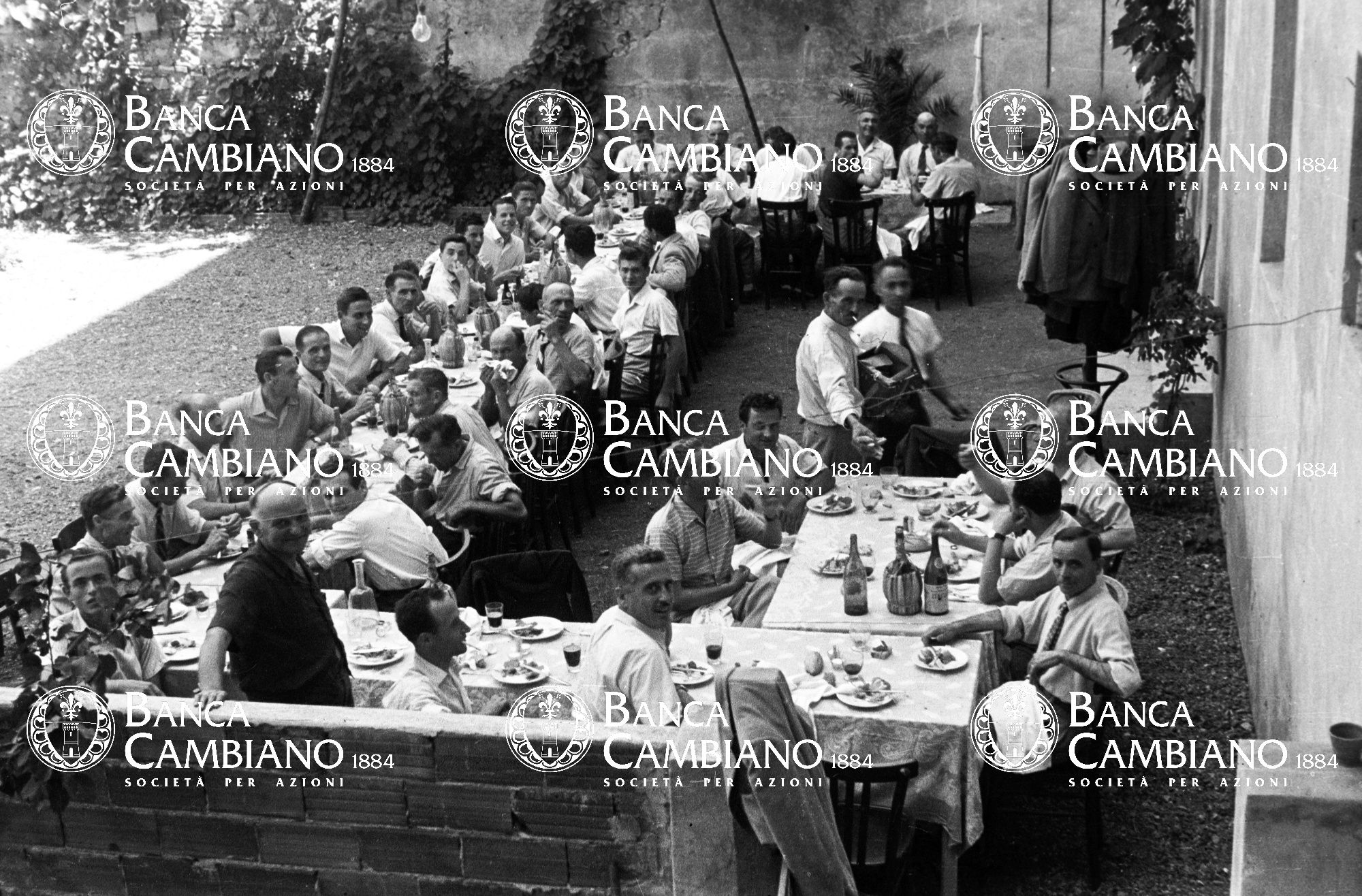 Gita sociale della cooperativa muratori: Ritratto del gruppo a pranzo