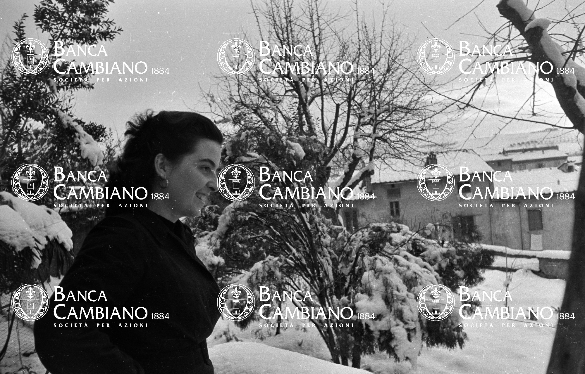 giardino, neve, veduta, donna, anni 50