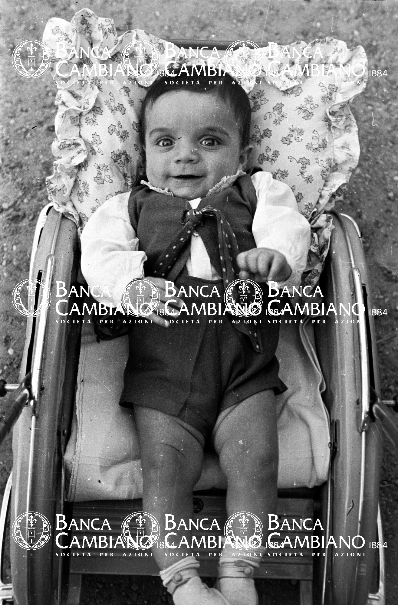 Ritratto di bambino nel passeggino in piazza Gramsci