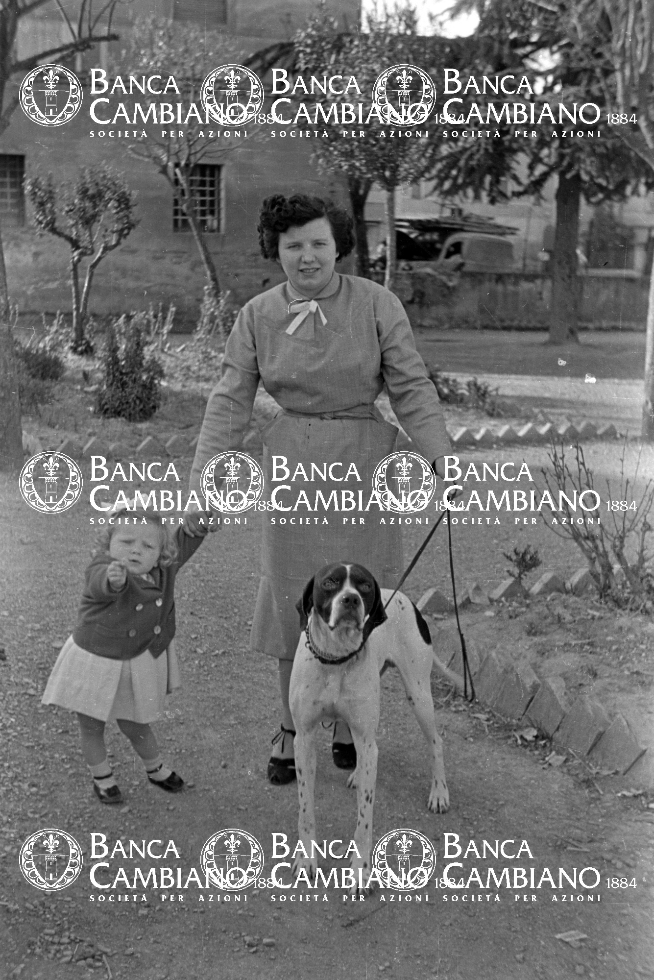 - ritratto di donna(Lina Maggiorelli) con la figlia Vittoria Bianchi e cane nei giardini pubblici vicino alla scuola elementare M.Tilli