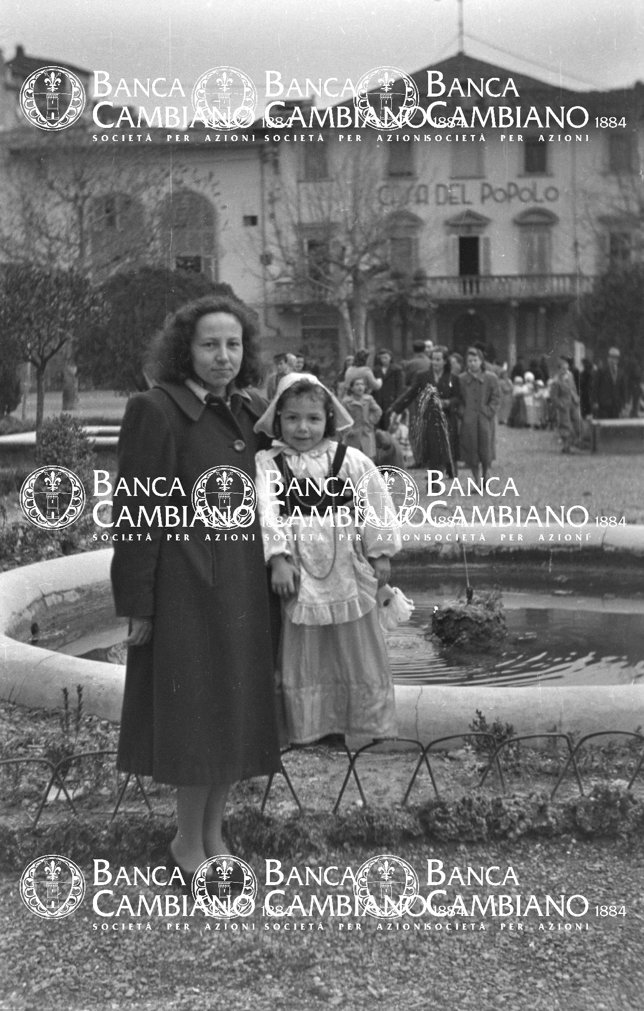 Ritratto di donna con bambina mascherate in piazza Gramsci
