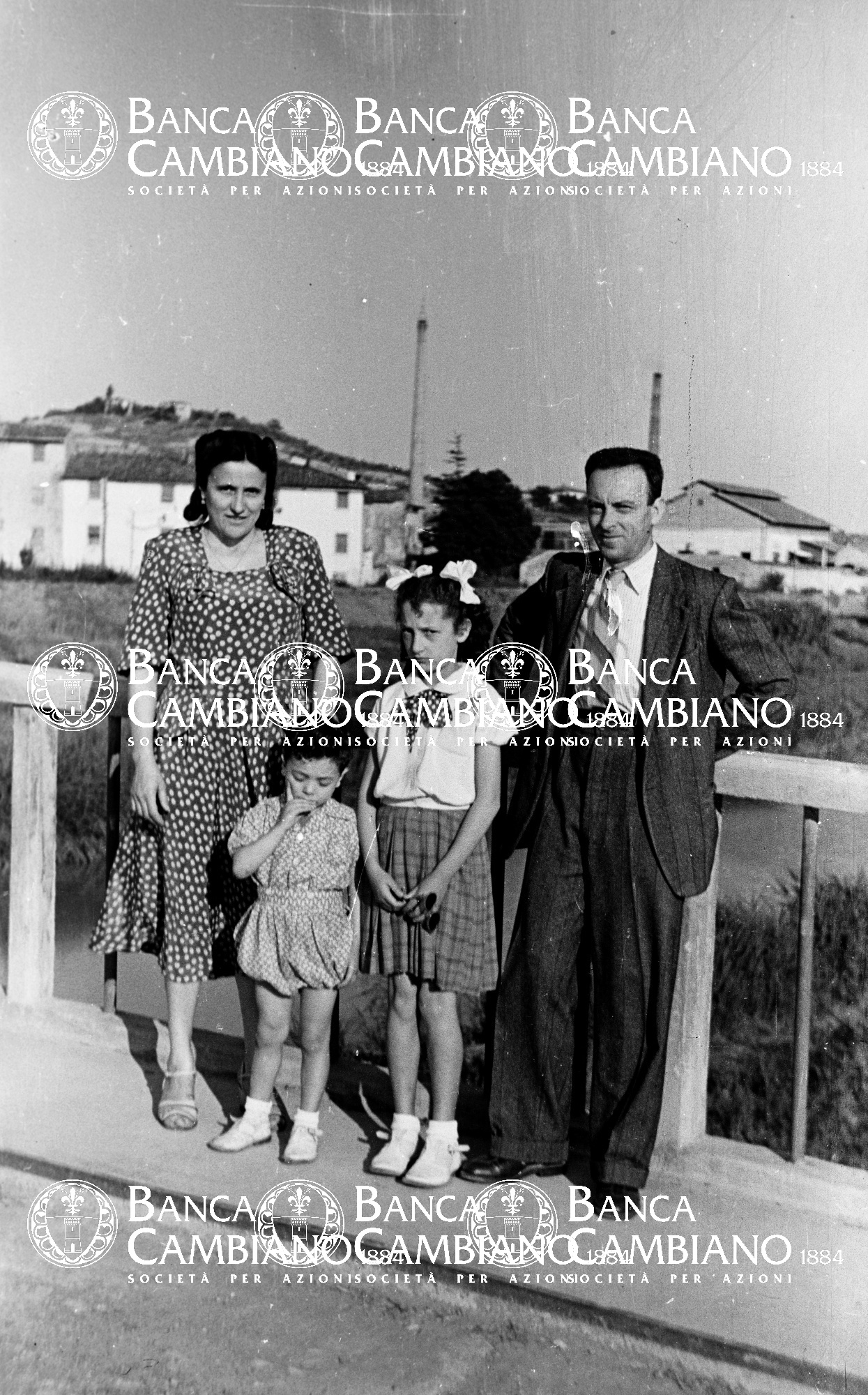 ritratto di uomo donna e bambine sul ponte sul fiume Elsa