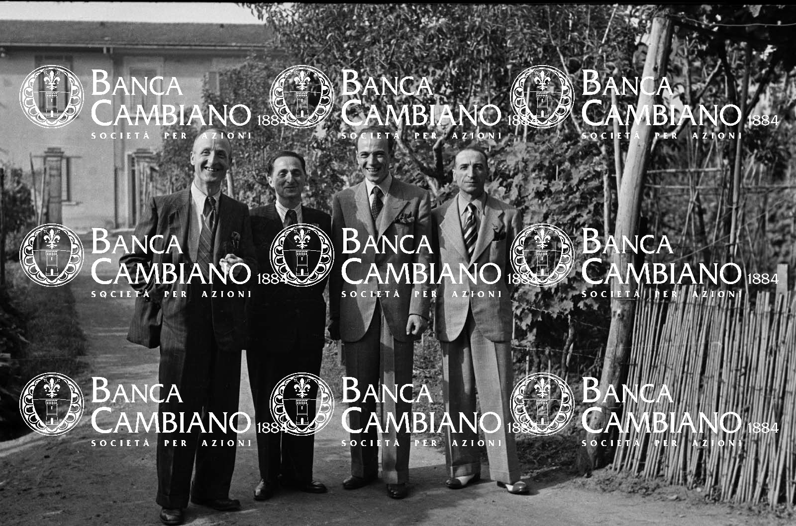 Uomini posano sul viale di casa durante uno sposalizio a Empoli