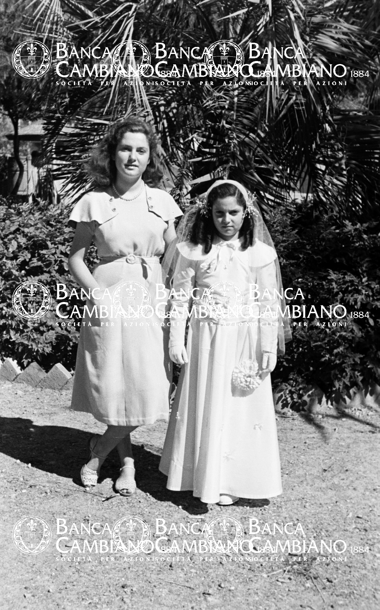 - ritratto di ragazza con bambina vestita da comunione ai giardini pubblici vicino alla scuola elementare M.Tilli