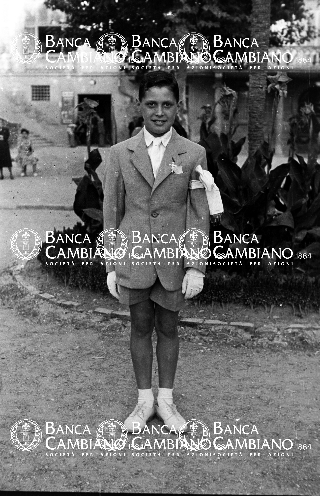 Ritratto di bambino vestito da comunione in piazza Gramsci
