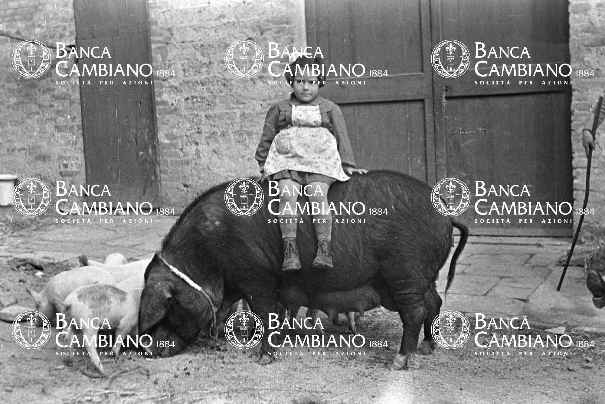 ritratto di bambina seduta su un maiale