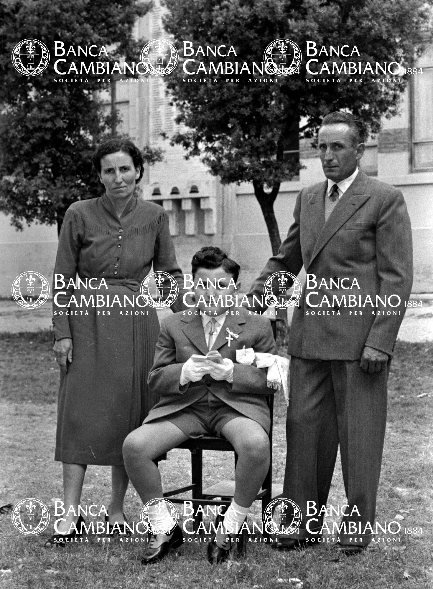 comunioni: ritratto di uomo e donna con bambino vicino alla chiesa di S.Verdiana
