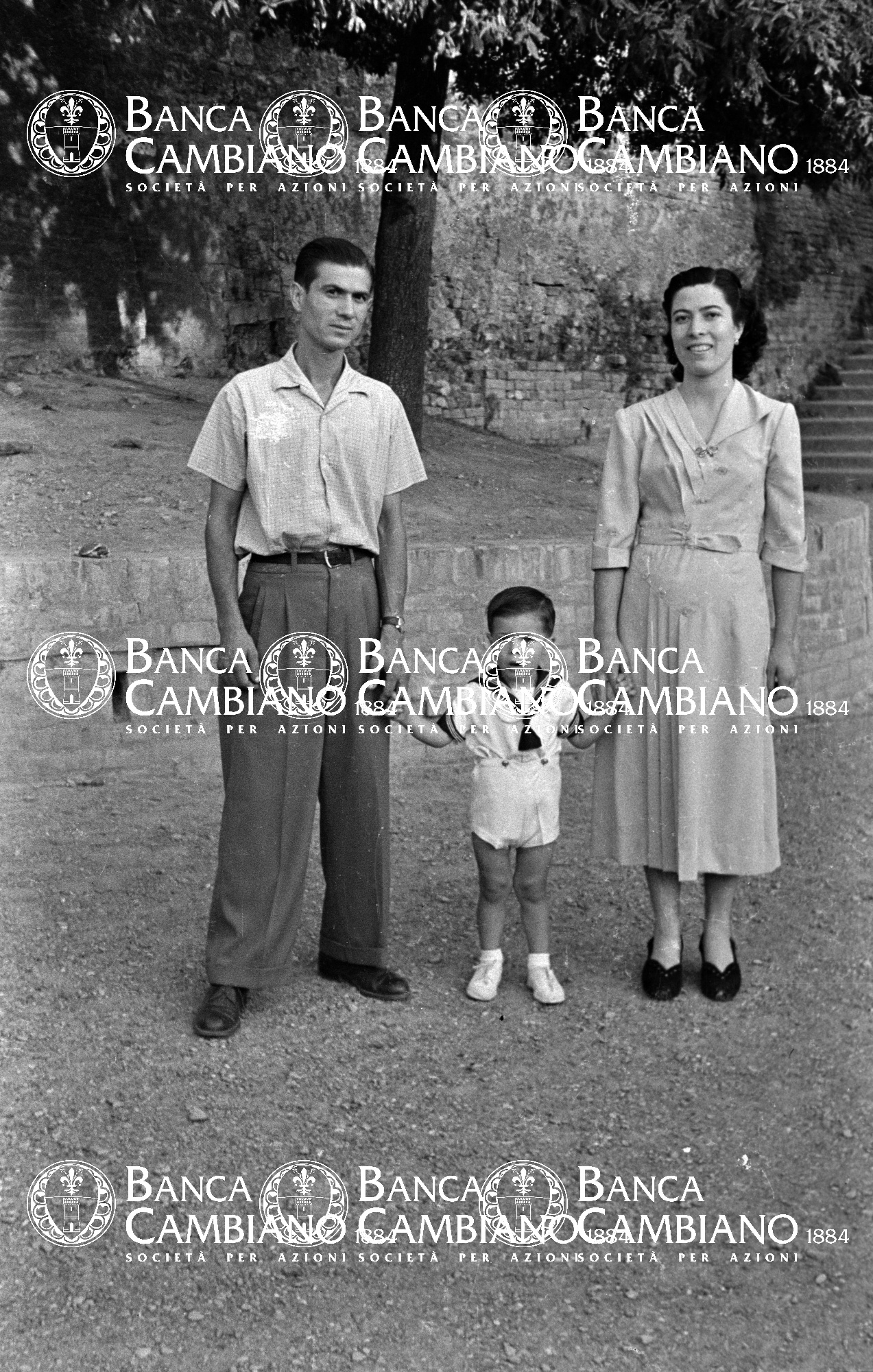 ritratto di uomo e donna con bambino in piazza Gramsci