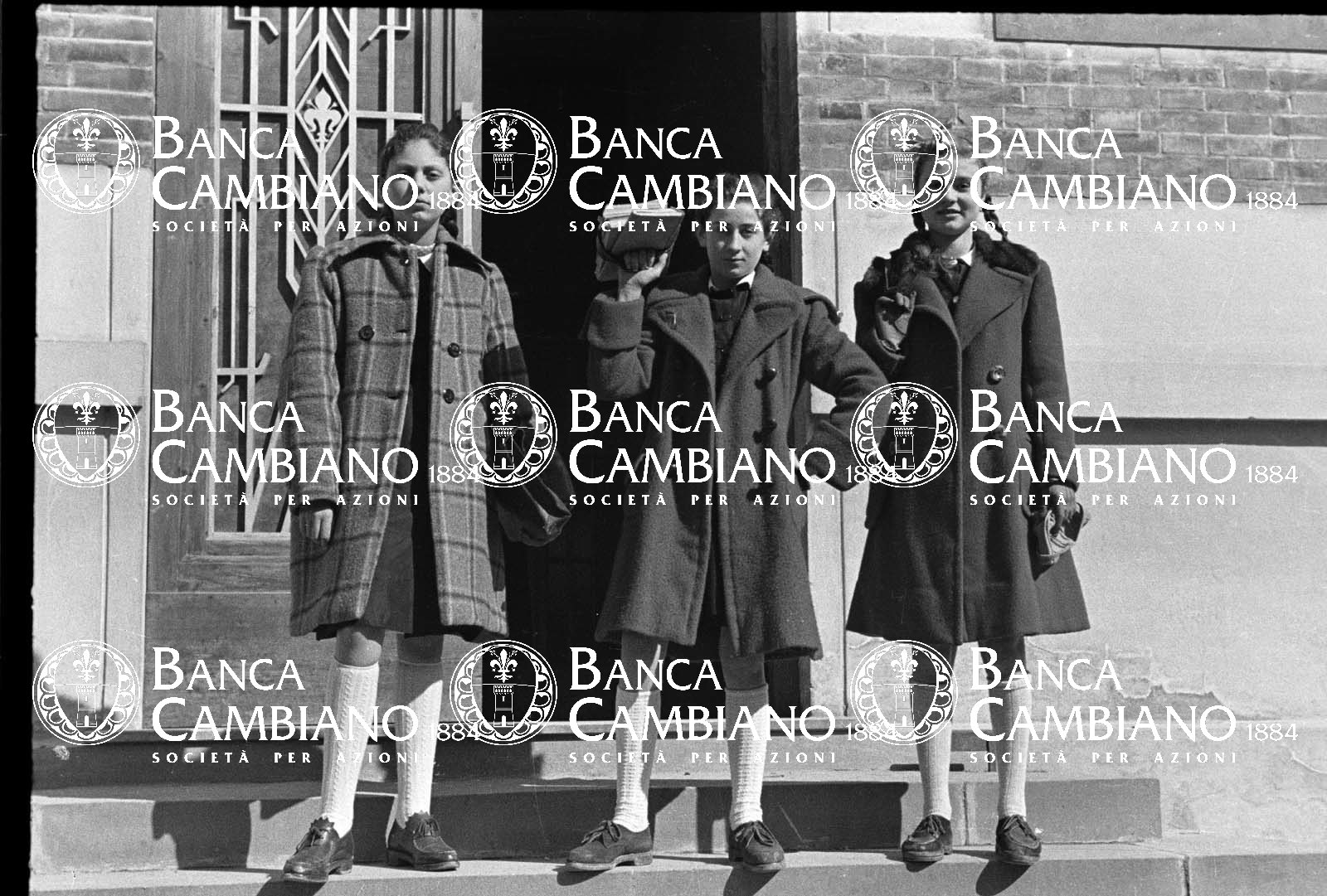 - Alunne davanti all'ingresso della scuola media Costanzo Ciano presso l'edificio della scuola elementare M. Tilli