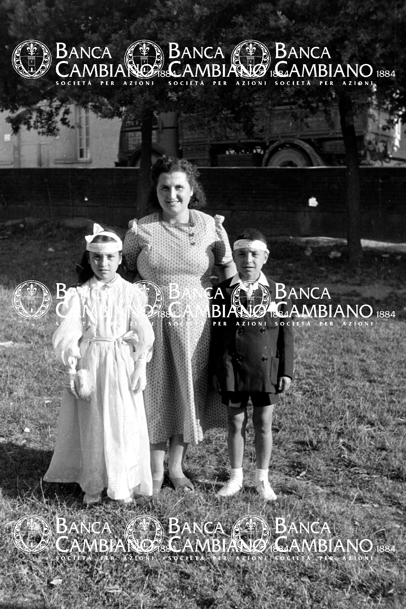 - Ritratto di donna con bambini vestiti da cresima nei giardini pubblici vicino alla scuola elementare M.Tilli