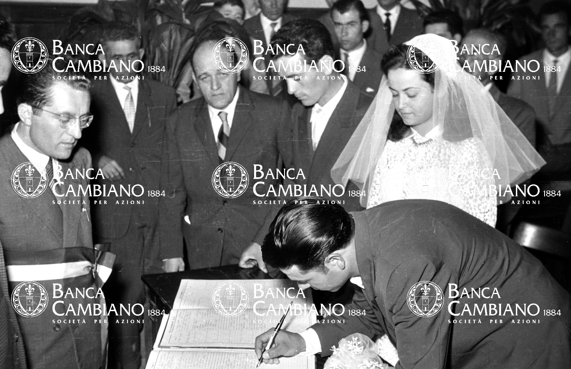- matrimonio civile nella sala comunale: firma dei documenti. Si riconosce nella foto, il sindaco Mario Cioni