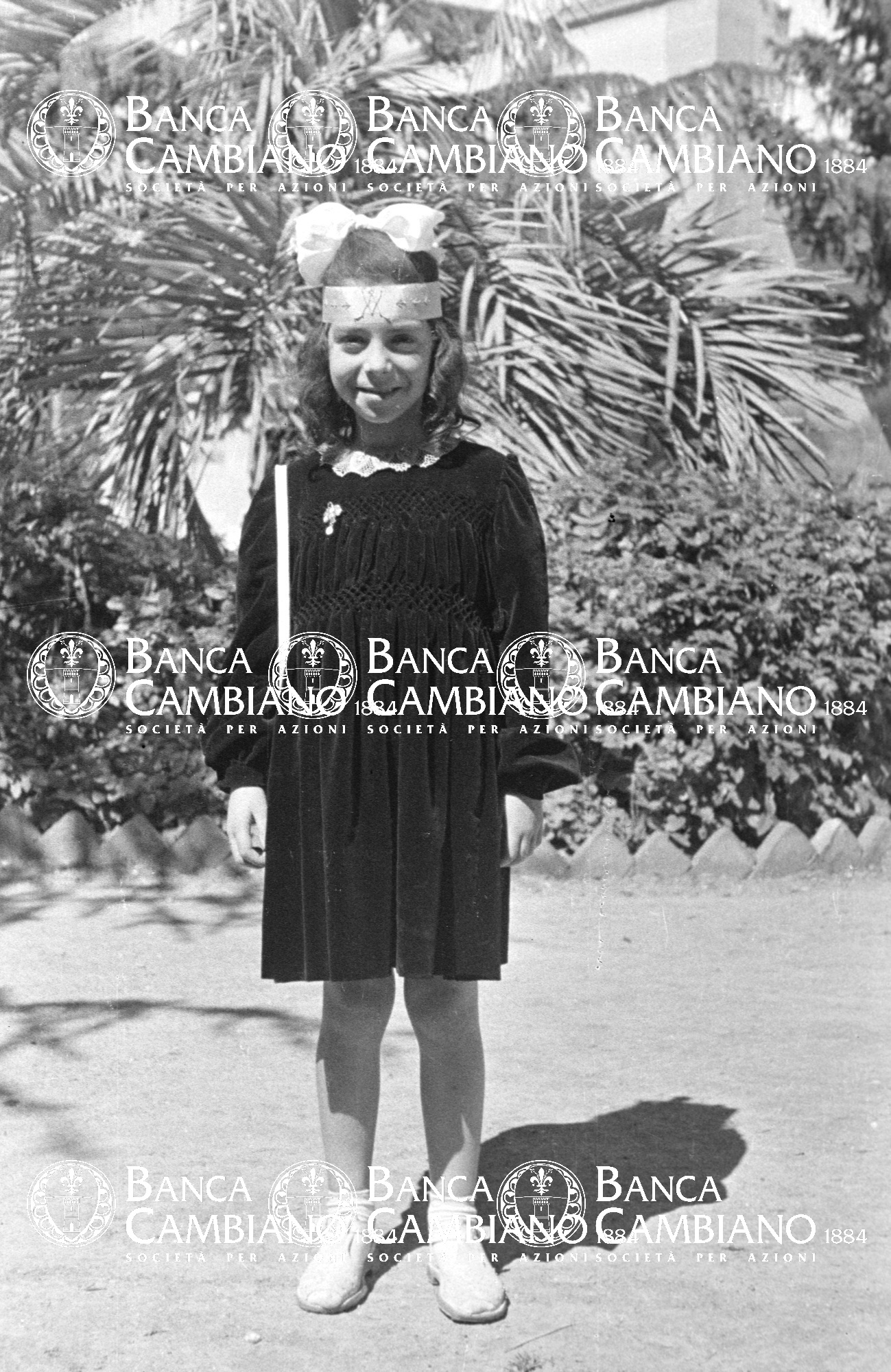 Ritratto di bambina vestita da cresima nei giardini pubblici vicino alla scuola elementare M.Tilli