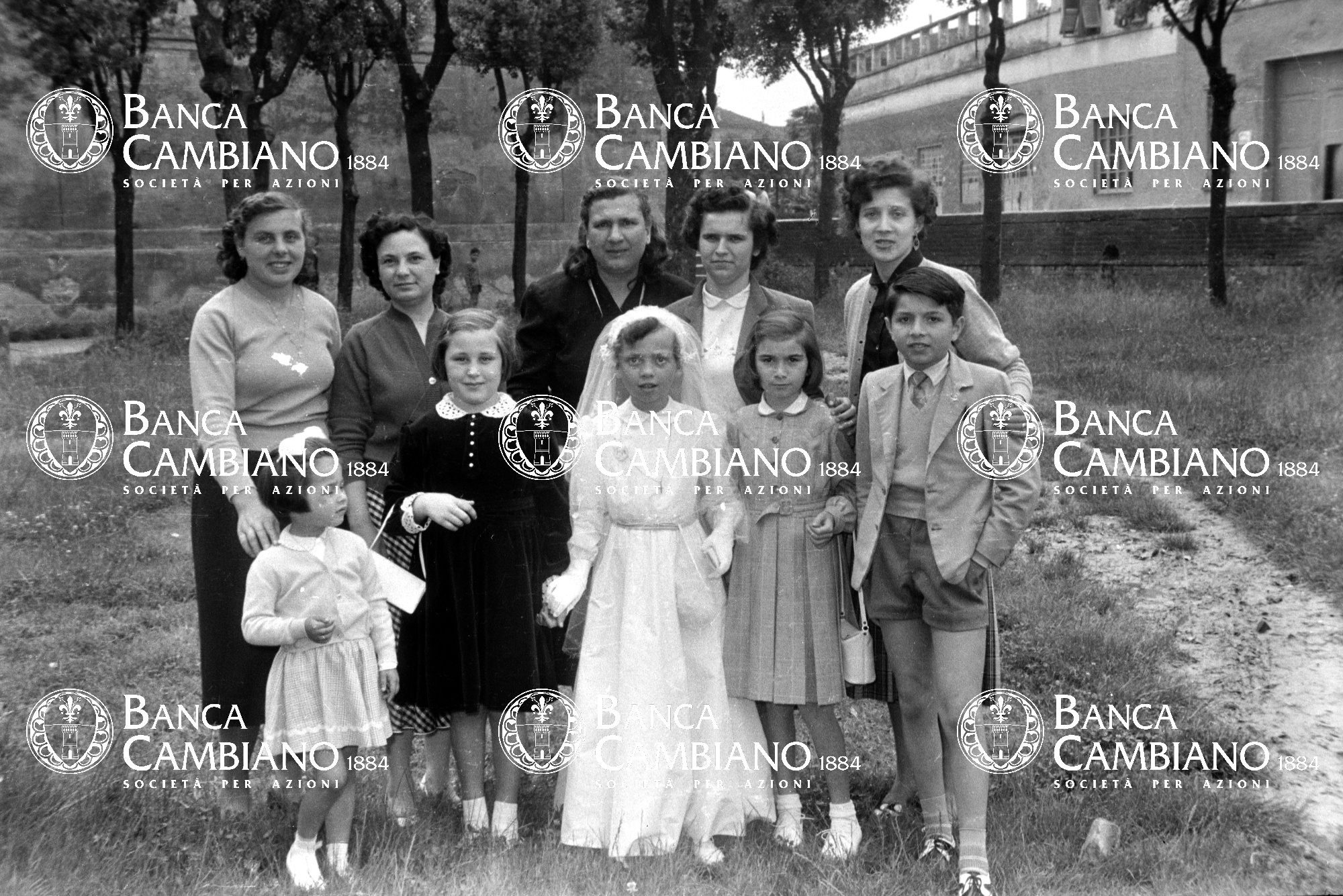 - comunioni: ritratto di gruppo nei giardini pubblici davanti alla chiesa di S.Verdiana