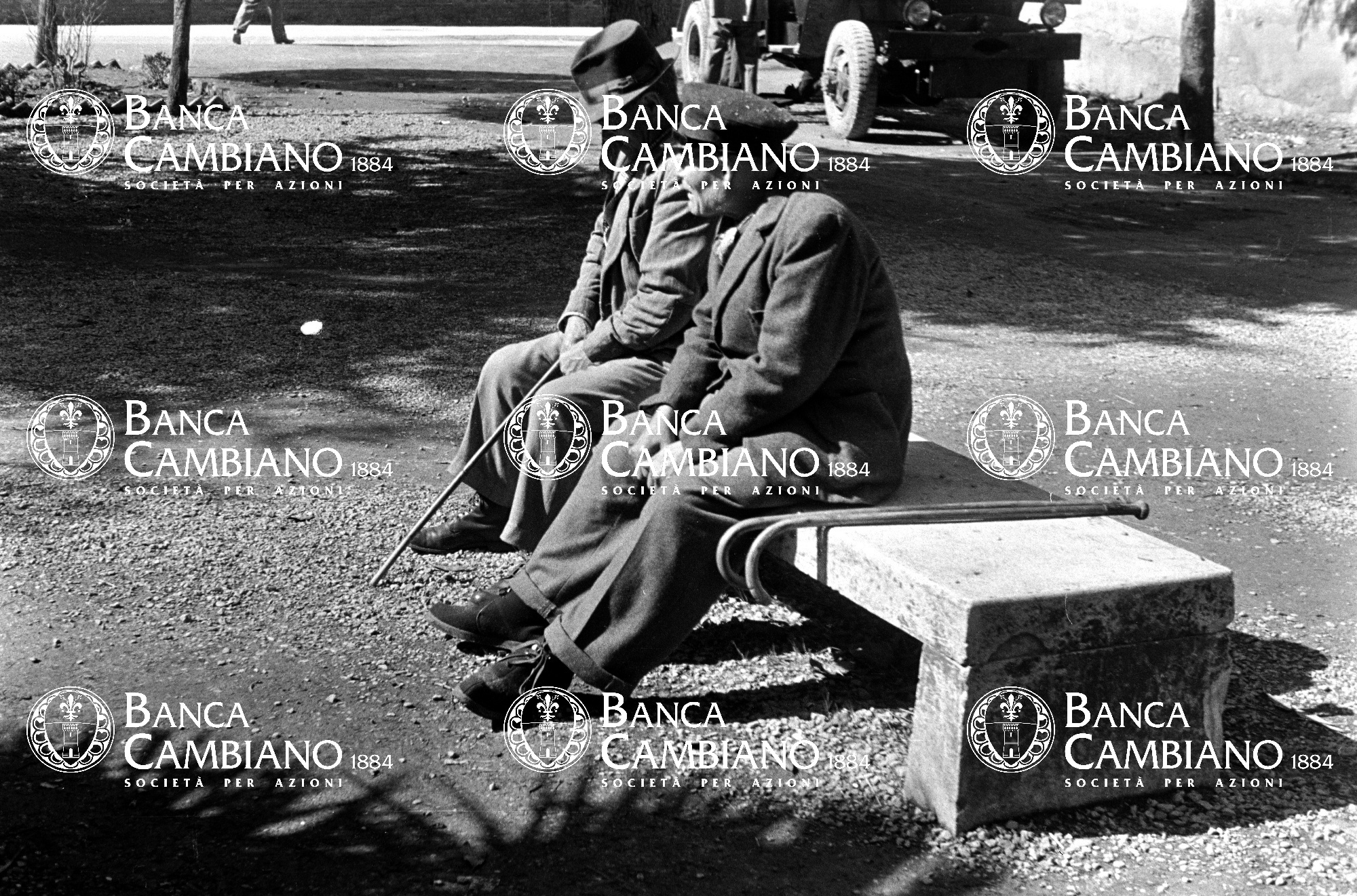 anziani su una panchina nei giardini pubblici vicino a piazza Marconi oggi piazza Kennedy