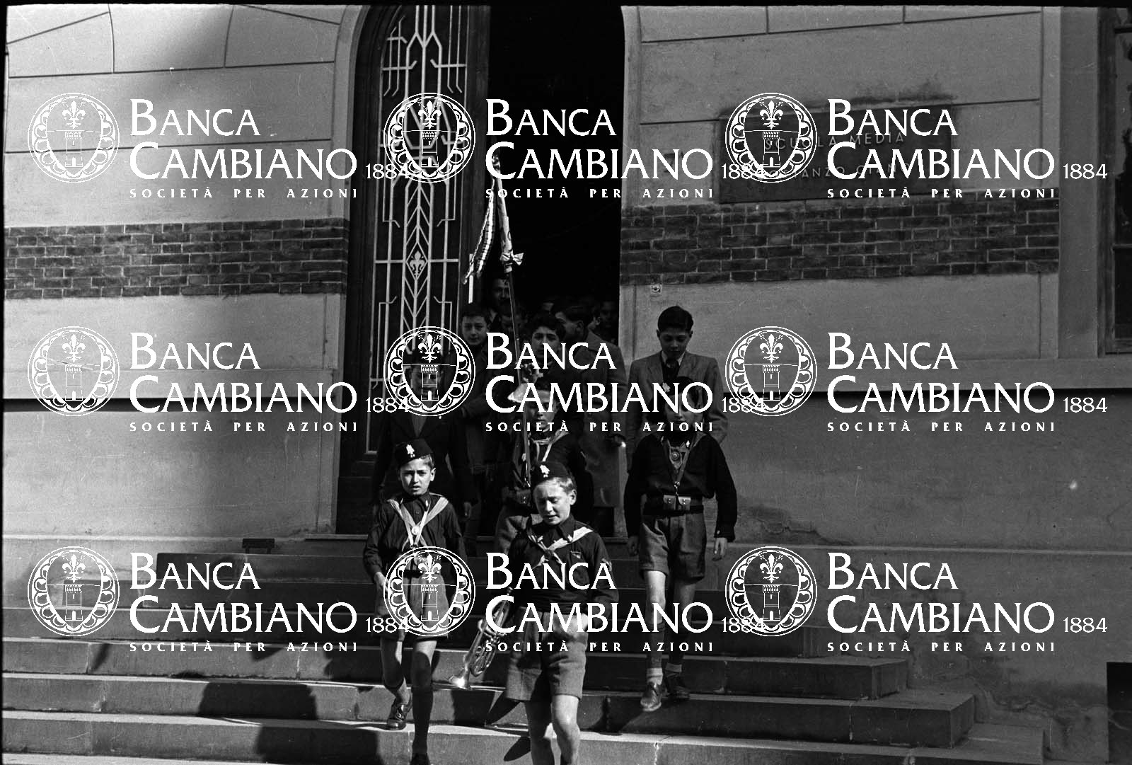 - Gruppo di alunni preceduti da bambini in divisa fascista che esce dalla scuola media Costanzo Ciano, sita nell'edificio delle scuole elementari M.Tilli