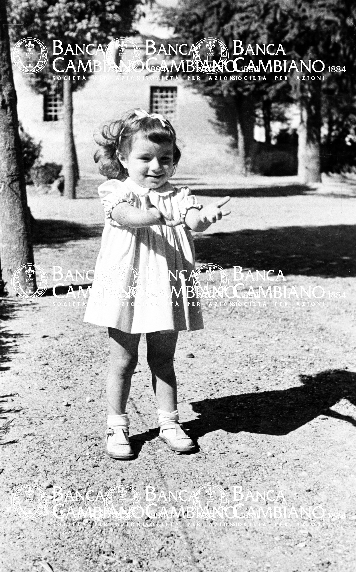 ritratto a figura intera di una bambina con braccia protese in avanti e palmi rivolti verso l'alto