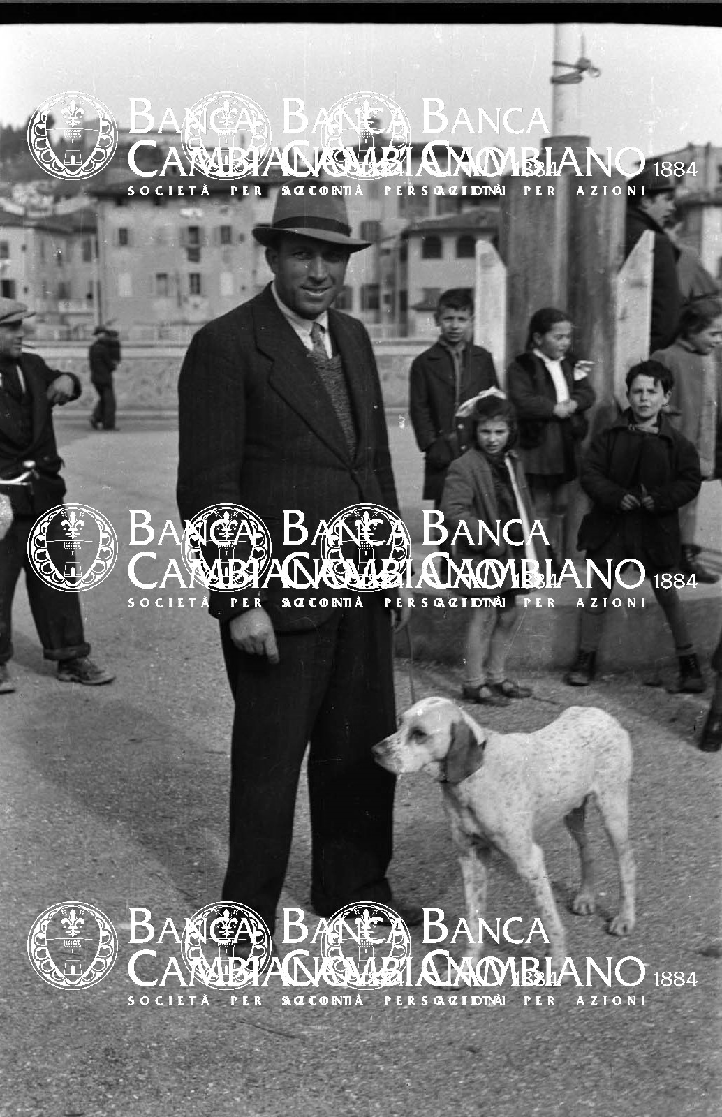 Uomo con cane, su Viale Roosevelt giĆ  Viale del Littorio contornato da bambini
