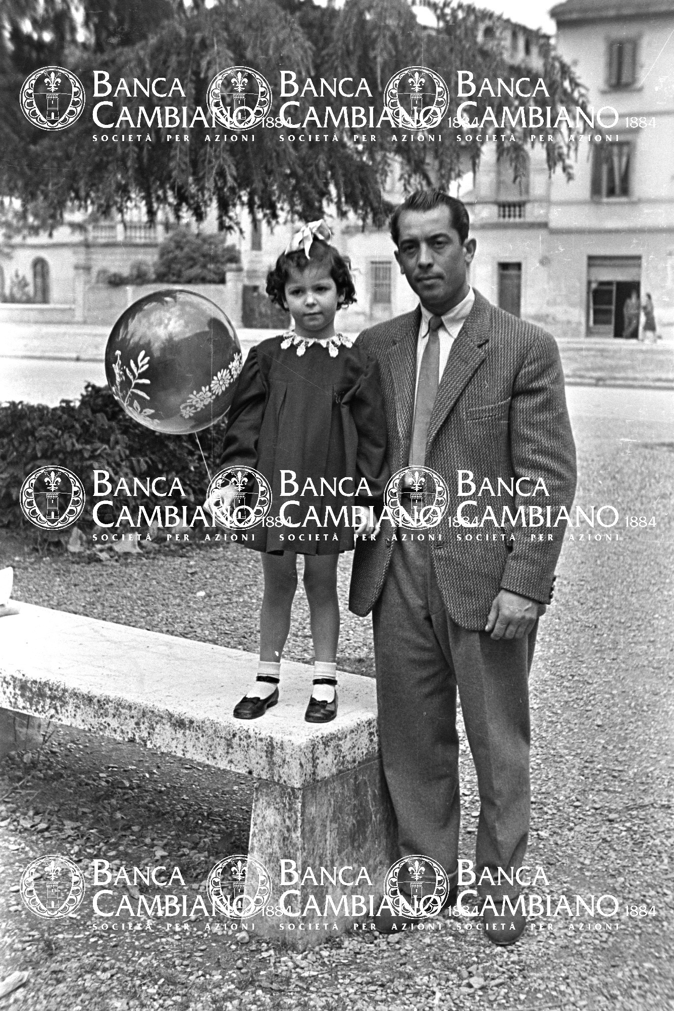- ritratto di bambina con palloncino e uomo nei giardini pubblici vicino alla scuola elementare M.Tilli; alle spalle, piazza Marconi oggi piazza kennedy