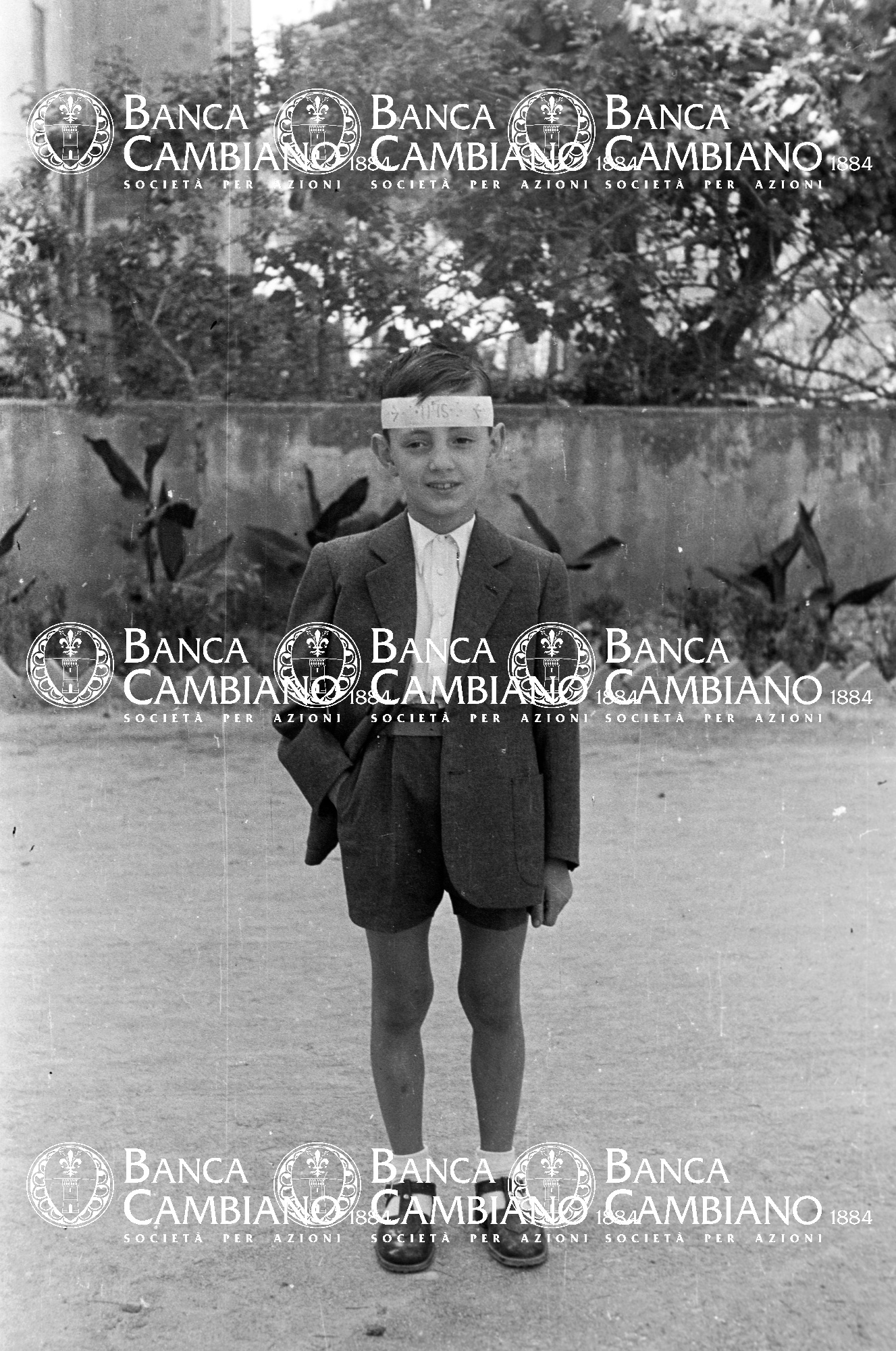 Ritratto di bambino vestito da cresima nei giardini pubblici vicino alla scuola elementare M.Tilli