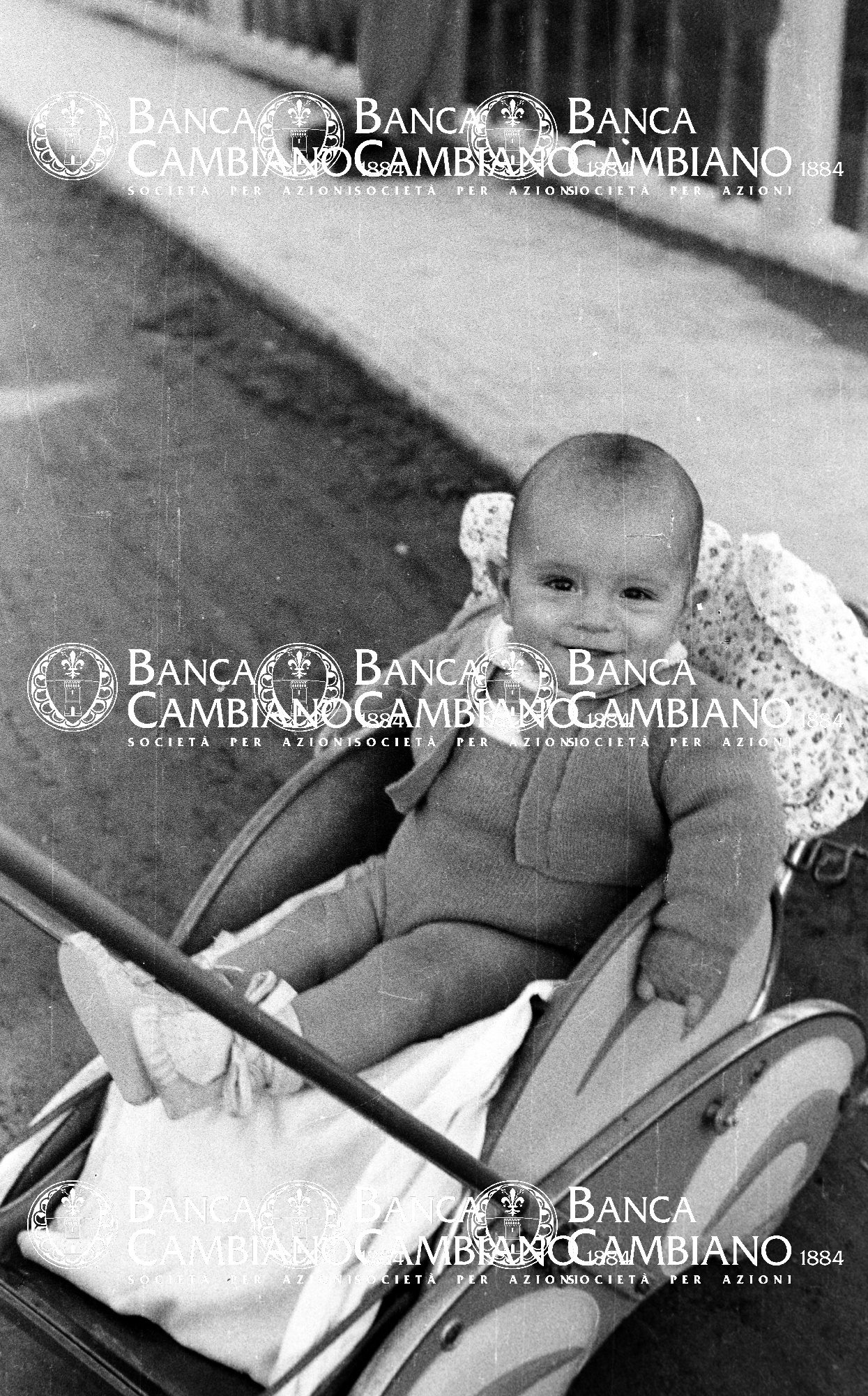 Ritratto di neonato nel passeggino sul ponte vicino piazza Cavour