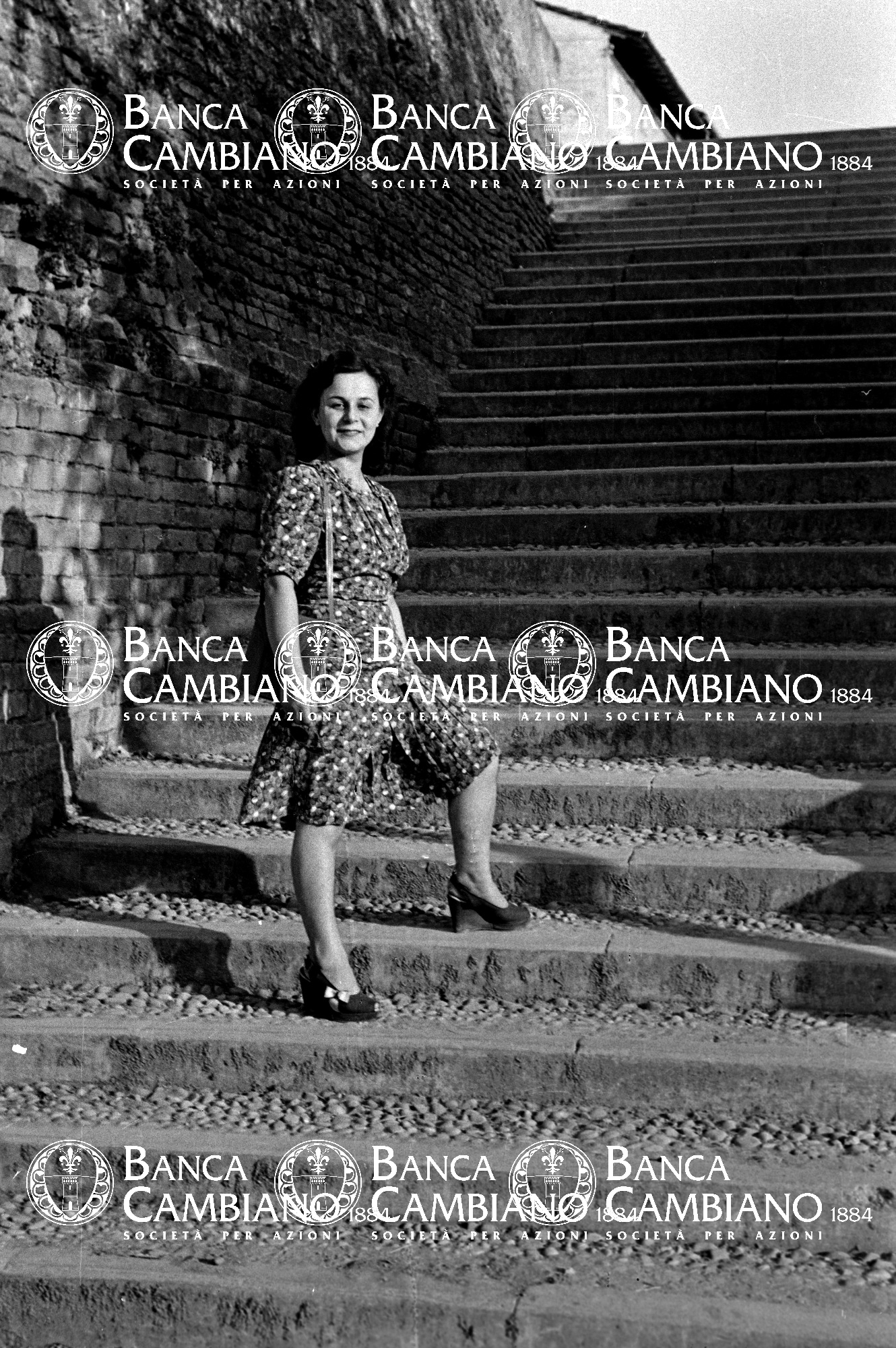 ritratto di donna alla scalinata vicino giardini pubblici in piazza Gramsci giĆ  piazza marconi