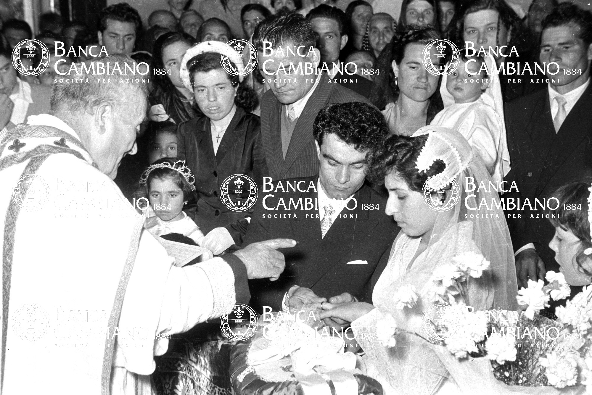 matrimonio: gli sposi e gli invitati in chiesa: scambio degli anelli