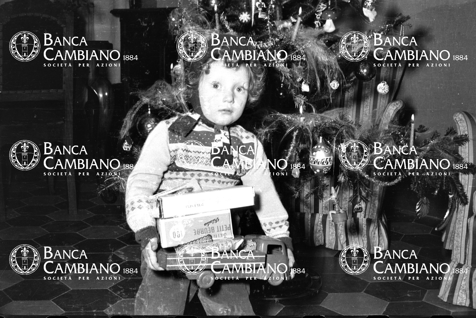 - ritratto di bambino con i regali vicino all' albero di Natale