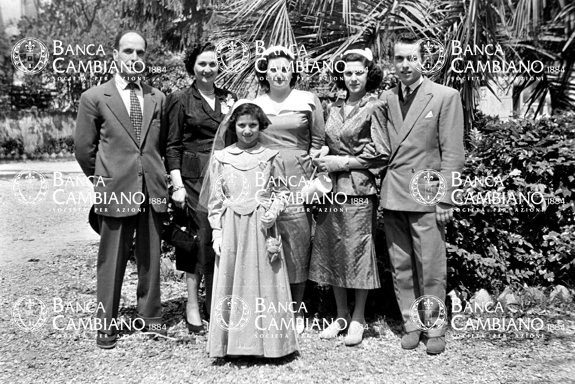 - comunioni: ritratto di gruppo nei giardini pubblici vicino alla scuola elementare M. tilli