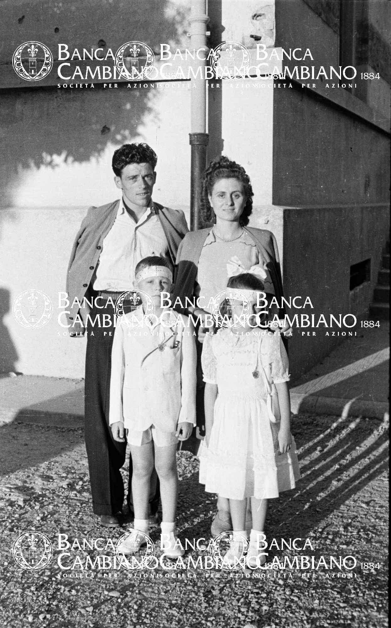 - Cresime: ritratto di donna e uomo con bambini nei giardini pubblici vicino alla scuola elementare M.Tilli