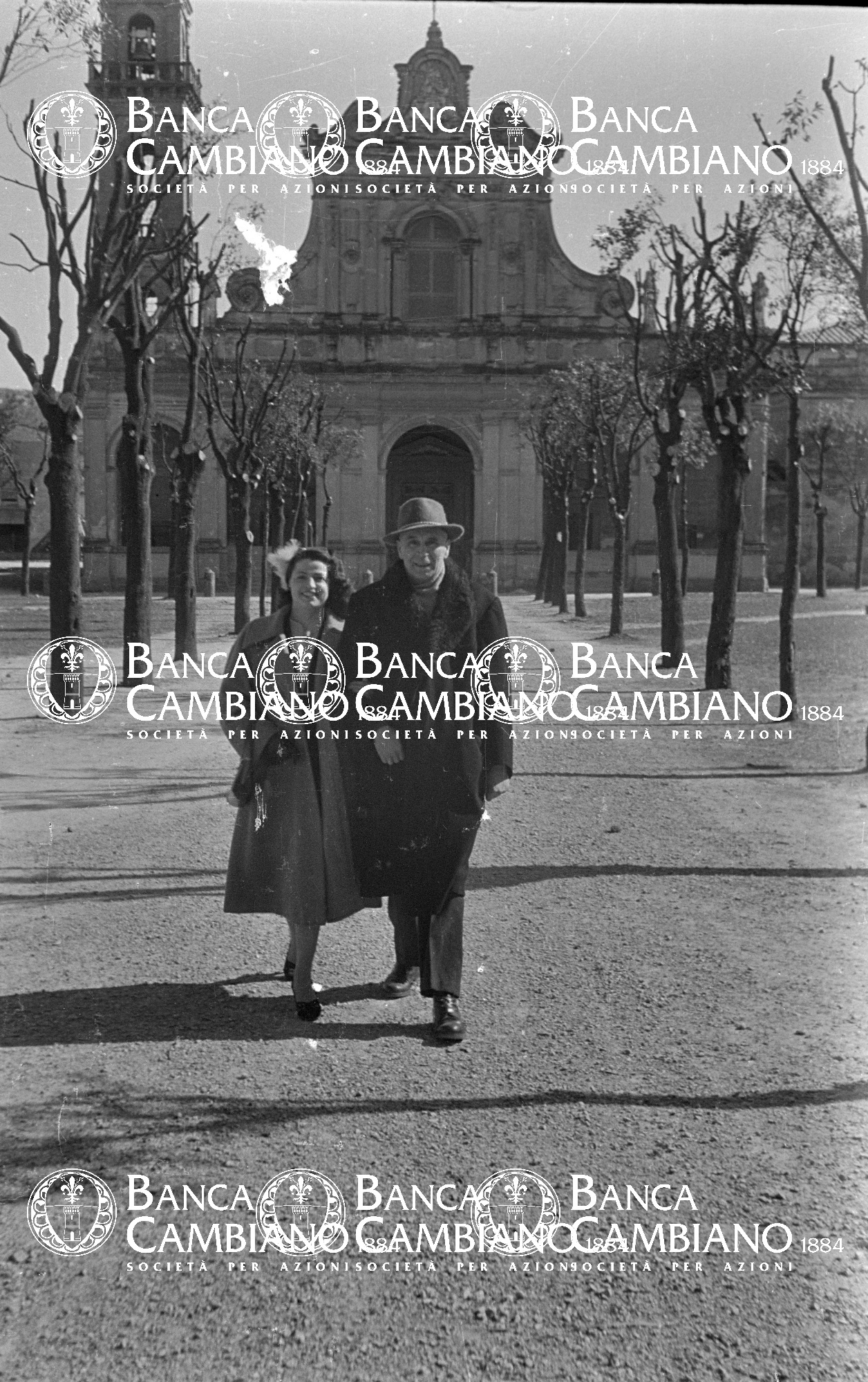ritratto di uomo con donna nei giardini pubblici sul viale davanti alla chiesa di S.Verdiana